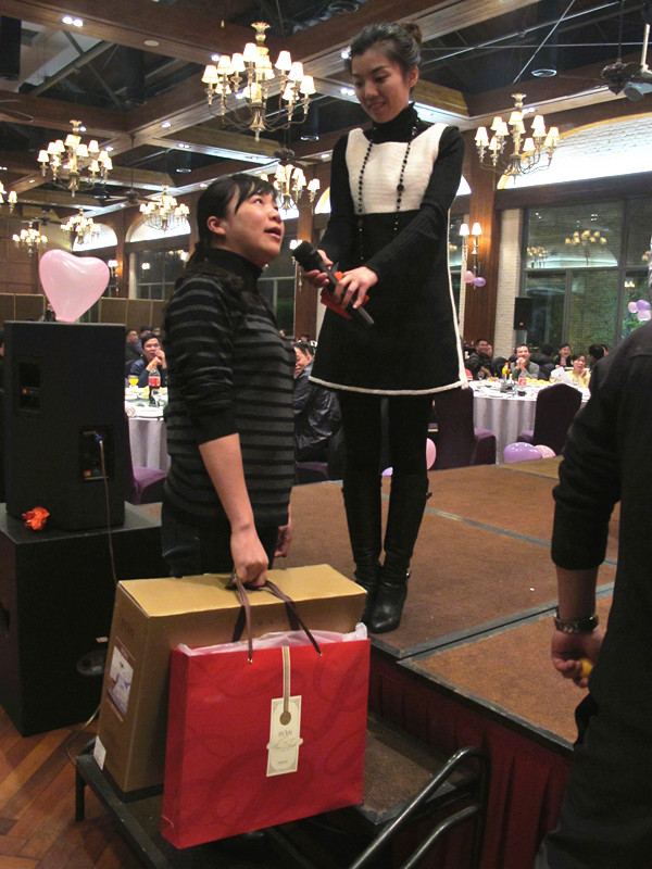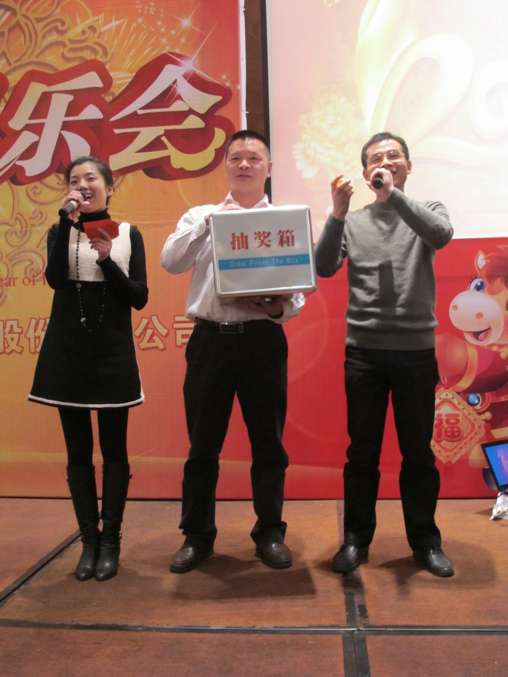 年會,最令人期待、最激動人心的時刻是抽獎環節。放眼望去,臺上擺滿了獎品,一等獎為mini ipad,二、三等獎均為價值不菲的名牌家紡。每個人都做好了心理準備,默祈大彩頭降臨自己。此外,為了增加抽獎的喜慶氣氛,今年的晚宴還別出心裁,規定中獎者須回答出主持人提出的問題或者即興表演一個節目后才能領取獎品。但這并沒有難倒我們的獲獎者,他們或詩歌朗誦,或民族舞表演,或引吭高歌,絲毫不怯場,熱情參與的氛圍讓晚宴的氣氛達到了高潮。