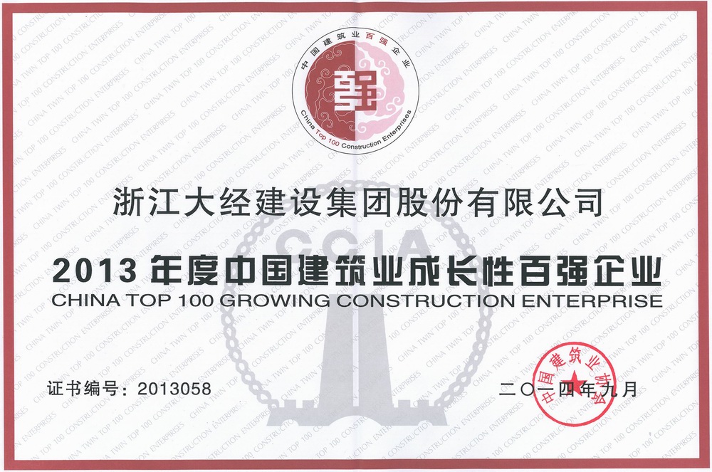 9月10日,2013年度中國建筑業“雙百強”企業發布會在貴陽市召開。浙江大經建設集團憑借優秀的綜合實力,以優異的成長性指數,入選“2013年度中國建筑業雙百強企業成長性百強企業”第58名。